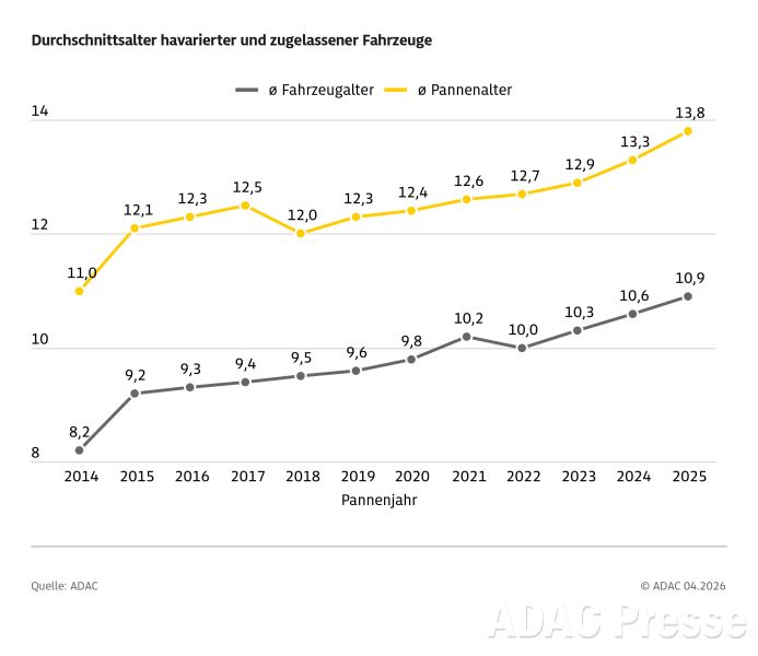 Generell gilt, dass die Pannenwahrscheinlichkeit höher wird, je älter das Fahrzeug ist. Dieser Trend hat sich in den vergangenen Jahren jedoch abgeschwächt: Ein zehn Jahre altes Fahrzeug hatte im Jahr 2015 noch eine Pannenwahrscheinlichkeit von 6,5 Prozent – 2025 waren es nur noch 3,1 Prozent. Gleichzeitig lag das Durchschnittsalter der im vergangenen Jahr von Pannen betroffenen Fahrzeuge im Schnitt bei knapp 14 Jahren. Der Umstand, dass die zugelassenen Fahrzeuge in Deutschland immer älter werden, sorgt dennoch dafür, dass die reine Zahl der Pannenhilfeeinsätze des ADAC im vergangenen Jahr gestiegen ist: Die Gelben Engel waren fast 3,7 Millionen Mal im Einsatz, was eine Steigerung um 1,6 Prozent im Vergleich zum Vorjahr bedeutet.