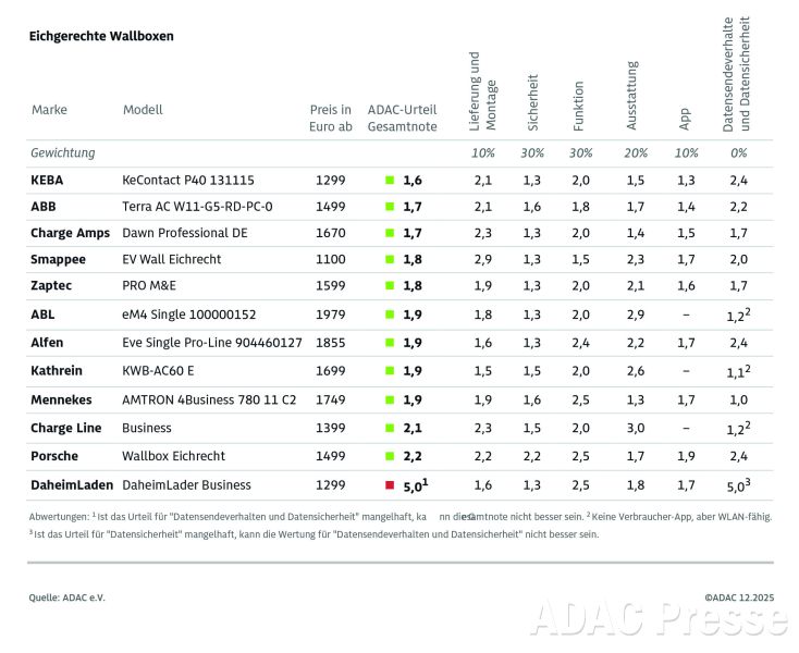 Der Punkt Standby-Verbrauch ist für das Modell der Marke DaheimLaden einer von zwei negativen Punkten: Die Wallbox verfügt über ein großes Display und hat mit 7,8 Watt den mit Abstand höchsten Standby-Verbrauch im Test – doch das war nicht das größte Problem: Im Rahmen des ADAC Tests wurden alle Wallboxen auf ihre IT-Sicherheit überprüft. Die „DaheimLader Business“ wies dabei gravierende Sicherheitsmängel auf. So konnten an der Wallbox selbst die Admin-Passwörter und die WLAN-Zugangsdaten des Kunden abgegriffen werden. Im weiteren Verlauf der Untersuchung wurden weitere Schwachstellen gefunden, die es sogar ermöglichten, in das Backend des Herstellers einzudringen. Der ADAC hat sowohl den Hersteller der DaheimLader-Wallbox („New Inergy“) als auch das Bundesamt für Sicherheit in der Informationstechnik (BSI) über die Erkenntnisse des Tests informiert. Der Hersteller zeigte einen professionellen Umgang mit den Fehlern, nahm die Wallbox zwischenzeitlich vom Markt, informierte laut eigenen Angaben die Kunden und versorgte betroffene Geräte mit Software-Updates. Das Problem ist New Inergy zufolge inzwischen behoben. Dieser akute Mangel überschattet die sonst guten Leistungen des DaheimLader Business, der aufgrund der Abwertung mit einem ADAC Urteil von 5,0 auf dem letzten Platz des Rankings landet.