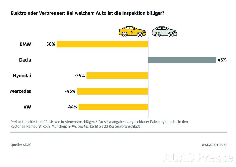 Die Anfragen, die vereidigte Kfz-Sachverständige im Auftrag des ADAC stellten, zeigten, dass die Kostenvoranschläge für Elektroautos generell geringer ausfielen als die für vergleichbare Verbrenner. Über alle drei Städte und ihre Umlandgemeinden hinweg waren die Wartungskosten für Verbrenner um mindestens ein Drittel höher als für die vergleichbaren Stromer. Das entspricht dem realen Aufwand, da E-Autos insgesamt wartungsärmer sind als Verbrenner. Sie haben weniger mechanische Bauteile und damit weniger Verschleißerscheinungen, denn es fehlen viele Teile wie Motoröl, Ölfilter oder Zündkerzen, die bei Verbrennern regelmäßig gewechselt werden müssen.