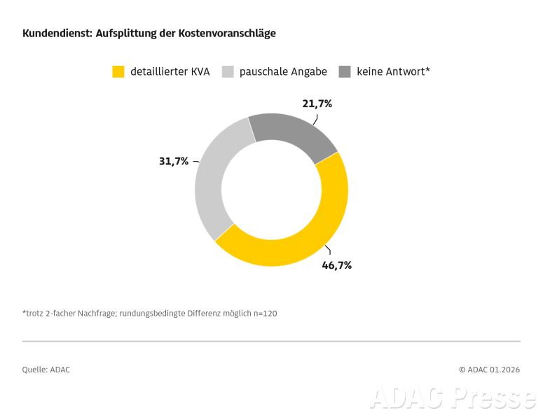 Ärgerlich für alle Autofahrerinnen und Autofahrer: Mehr als jede fünfte Werkstatt (26 von 120) hat auf die Anfrage der ADAC Experten nicht geantwortet – auch nicht nach mehrmaliger Nachfrage. In 56 Fällen erhielten die Tester einen kalkulierten Kostenvoranschlag, davon waren nur 39 Angebote detailliert und nachvollziehbar aufgeschlüsselt. In 38 Fällen erhielt der ADAC lediglich Pauschalbeträge. Vor allem BMW sowie Volkswagen legten detaillierte Kostenvoranschläge vor. Viele Pauschalangebote waren preislich vergleichbar, einige blieben aber intransparent, da die Leistungen nicht im Detail aufgelistet waren.