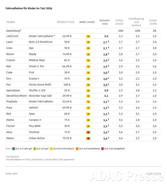 Im Rahmen des Testverfahrens wurden in diesem Jahr die Kriterien weiterentwickelt: So gibt es zusätzliche Bewertungspunkte für die Riemen und das Verschlusssystem. Dazu zählen der Mikroschlupf, also ein unerwünschtes Verstellen der Verschlüsse während der Fahrt, der Rütteltest an den seitlichen Gurtteilen sowie die Prüfung, ob sich Verschlüsse unbeabsichtigt lösen können. Angepasst sind zudem einige Bewertungen des Tragekomforts. Die Ergebnisse sind deshalb mit dem letzten Kinderhelmtest von 2022 nur bedingt vergleichbar. Die gestiegenen Anforderungen und eine unzureichende Weiterentwicklung der Produkte führen dazu, dass kein Helm die Gesamtnote „gut“ erreicht“.