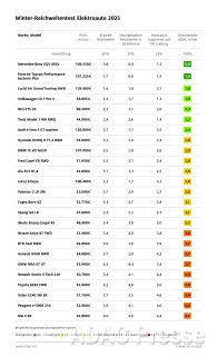 ADAC Reichweitentest E-Autos im Winter: Getestet wurden die reichweitenstärksten Elektroautos von 25 verschiedenen Marken mit einer WLTP-Reichweite von mindestens 500 Kilometern.