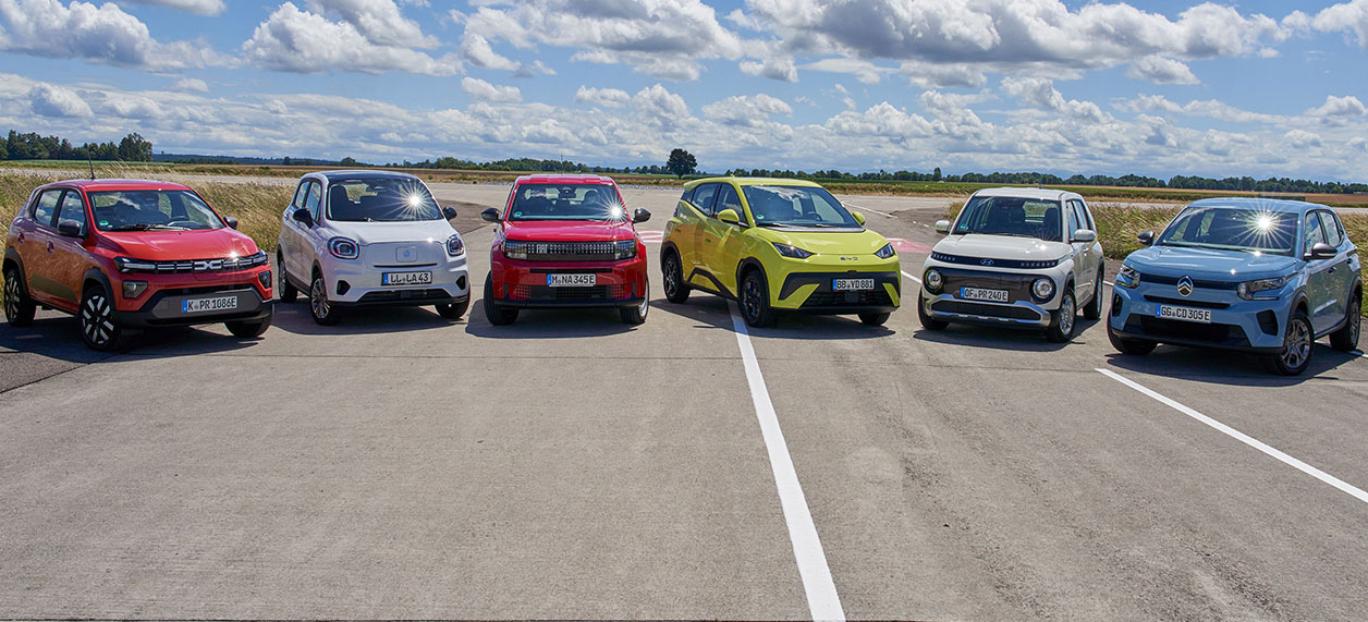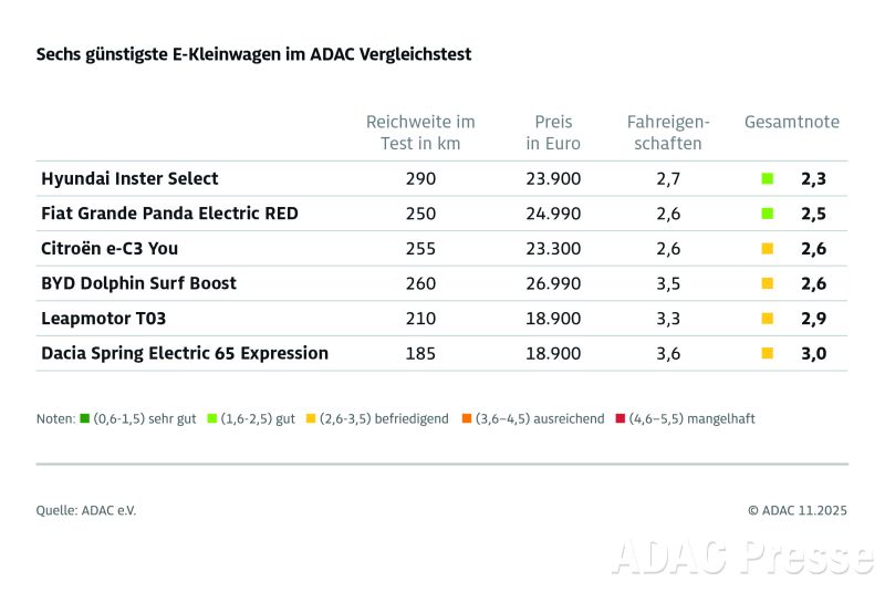 Der ADAC hat im bislang größten Vergleichstest sechs elektrische Klein- und Kleinstwagen gegeneinander antreten lassen: Der Citroën e-C3 You, der Fiat Grande Panda Electric Red, der Hyundai Inster Select, der BYD Dolphin Surf Boost (das einzige Auto im Vergleich, das teurer als 25.000 Euro ist), der Leapmotor T03 sowie der Dacia Spring Electric 65 Expression. Deutsche Hersteller findet man in der Preiskategorie rund um 25.000 Euro übrigens vergeblich – kleine E-Autos wie der VW e-Up! wurden ohne direkten Nachfolger eingestellt. Der Markt wird also weiterhin von Importeuren dominiert, unter denen besonders die chinesischen Hersteller wie BYD und Leapmotor stark auf den Markt drängen.