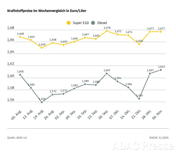 Während der Preis für Super E10 im Vergleich zur Vorwoche unverändert ist, hat sich Diesel leicht verteuert – das zeigt die aktuelle ADAC Auswertung der Kraftstoffpreise in Deutschland. Laut ADAC kostet ein Liter Super E10 im bundesweiten Mittel 1,677 und damit gleich viel wie vor Wochenfrist. Der Preis für einen Liter Diesel ist im selben Zeitraum um 0,6 Cent gestiegen und liegt aktuell im Schnitt bei 1,613 Euro.