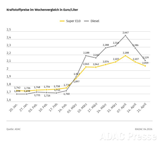 Diesel hat sich im Vergleich zur Vorwoche nochmals sehr deutlich verbilligt: Der Preis für einen Liter ist laut aktueller ADAC Auswertung der Kraftstoffpreise um 15,7 Cent gesunken und liegt nun bei durchschnittlich 2,129 Euro. Seit dem Allzeithoch (2,447 Euro/Liter) vor rund zwei Wochen ist der Dieselpreis damit um 31,8 Cent gesunken. Auch der Preis für Super E10 hat im Wochenvergleich spürbar nachgegeben: Ein Liter kostet aktuell im bundesweiten Mittel 2,059 Euro – ein Minus von 4,8 Cent.