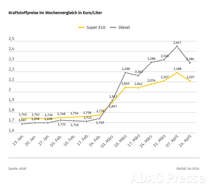 Leichte Entspannung am Kraftstoffmarkt, aber noch lange keine Entwarnung - so könnte man die Entwicklung der Kraftstoffpreise während der vergangenen Woche bewerten. Wie die aktuelle ADAC Auswertung der Kraftstoffpreise in Deutschland zeigt, ist vor allem der Dieselpreis sehr deutlich gesunken: Danach kostet ein Liter des Kraftstoffs im bundesweiten Durchschnitt derzeit 2,286 Euro, das sind 16,1 Cent weniger als vor einer Woche. Nur etwa halb so stark ist Benzin billiger geworden: Für einen Liter Super E10 müssen die Autofahrerinnen und Autofahrer im Mittel 2,107 Euro je Liter bezahlen – ein Minus von 8,1 Cent. Der Rohölpreis als maßgebliche Größe zur Bewertung der Kraftstoffpreise rangiert wie in der Vorwoche bei etwa 95 US-Dollar. Damals wurde der zweiwöchige Waffenstillstand zwischen den USA und Iran verkündet. Als Folge war der Ölpreis im Tagesverlauf um bis zu 15 Prozent abgestürzt und schloss auf einem ähnlichen Niveau wie derzeit. Erst mit Verzögerung kam dies auch bei den Preisen an den Zapfsäulen an.
