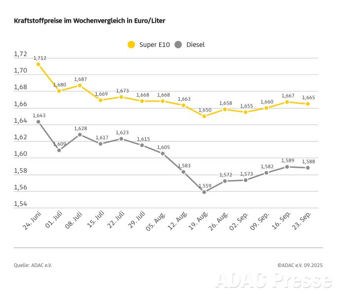 Seit mehreren Wochen treten die Kraftstoffpreise mehr oder weniger auf der Stelle und auch die heutige ADAC Auswertung zeigt nur eine minimale Veränderung gegenüber der Vorwoche. So registriert der ADAC einen Rückgang von 0,2 Cent je Liter bei Super E10 und von 0,1 Cent bei Diesel. Damit kostet ein Liter Super E10 im bundesweiten Mittel derzeit 1,665 Euro, ein Liter Diesel 1,588 Euro.