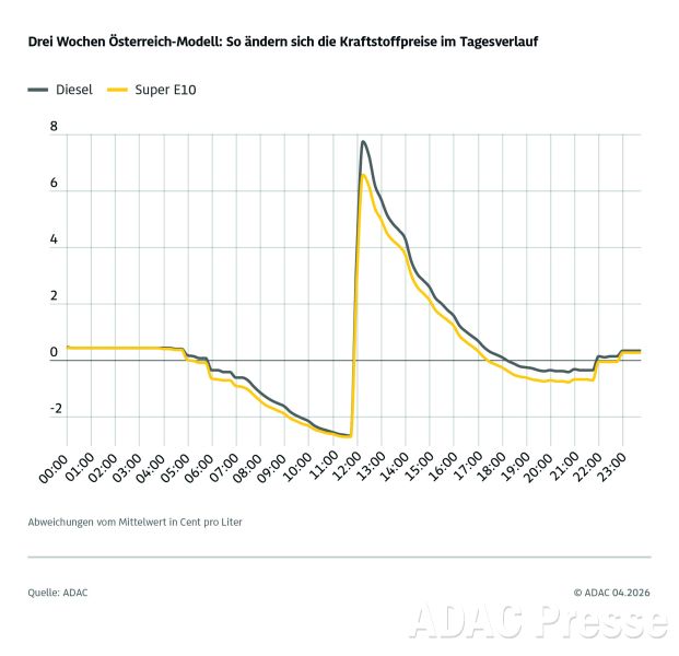 Eine aktuelle ADAC Auswertung der Kraftstoffpreise während der ersten zweieinhalb Wochen im April 2026 von mehr als 14.000 Tankstellen in Deutschland zeigt, dass die Preise für Benzin und Diesel im Tagesverlauf um zwölf Uhr stark steigen. So verteuert sich Super E10 im Schnitt um gut neun Cent je Liter, Diesel sogar um 10,5 Cent. Danach sinken die Preise bis zum frühen Abend langsam ab. Bis zum nächsten Morgen liegen sie relativ stabil im Bereich des Tagesdurchschnitts. Bereits ab 6 Uhr kann man unterhalb des Tagesdurchschnitts tanken, ab ca. 10 Uhr liegt der Preis etwa zwei Cent unter dem Tagesdurchschnitt. Kurz vor 12 Uhr, wenn die Preise um 2,7 Cent unterhalb des Mittelwertes liegen, ist der günstigste Tankzeitpunkt des Tages erreicht. Um 12 Uhr findet der tägliche einmalige Preisanstieg erneut statt.