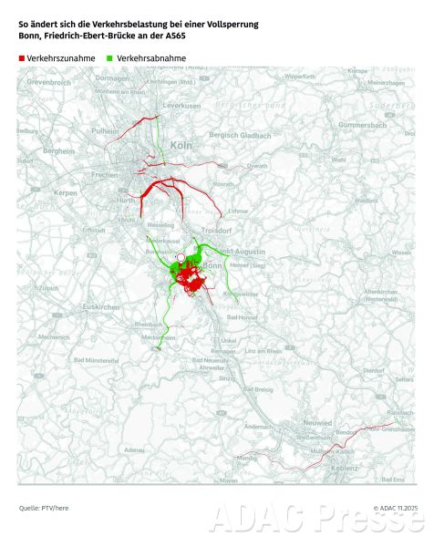 Dramatisch wären auch die Folgen einer Sperrung der Friedrich-Ebert-Brücke (A565) über den Rhein in Bonn. Pro Tag fahren hier 120.000 Fahrzeuge. Pkw müssten Umwege von insgesamt 50 Millionen Kilometer in Kauf nehmen, Lkw 5,5