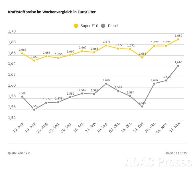 Tanken ist gegenüber der vergangenen Woche spürbar teurer geworden. Vor allem der Preis für Diesel-Kraftstoff ist kräftig gestiegen. Das zeigt die aktuelle ADAC Auswertung der Kraftstoffpreise von mehr als 14.000 Tankstellen in Deutschland. Danach kostet ein Liter Super E10 im bundesweiten Mittel 1,689 Euro und damit 1,2 Cent mehr als vor Wochenfrist. Der Dieselpreis kletterte sogar um 2,7 Cent und liegt jetzt bei durchschnittlich 1,640 Euro. Damit hat sich Diesel innerhalb von nur drei Wochen um 7,5 Cent verteuert. Super E10 hat im gleichen Zeitraum etwas mehr als drei Cent zugelegt.