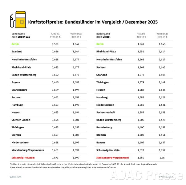 Für die heutige Untersuchung hat der ADAC die Preisdaten von mehr als 14.000 bei der Markttransparenzstelle für Kraftstoffe erfassten Tankstellen ausgewertet und den 16 Bundesländern zugeordnet. Die ermittelten Preise stellen eine Momentaufnahme vom 11. Dezember 2025, 11 Uhr, dar.