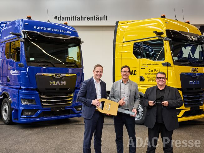 (ADAC Service GmbH) München, 28. Oktober 2025 – Die ADAC Service GmbH (ASG) baut ihr Geschäft als Full-Service-Logistiker für Fahrzeugtransporte weiter aus. Seit der strategischen Übernahme der Car-Port Autotransport GmbH zu Jahresbeginn bündelt die ASG Fahrzeugtransporte unter einem Dach – und stärkt diesen Bereich nun mit zehn neuen MAN Trucks TGX 18.480. Die letzten fünf Sattelzugmaschinen wurden am vergangenen Freitag im MAN Truck Forum München in Empfang genommen. Mit der Investition setzt der ADAC auf effiziente Fahrzeugtechnik und legt zugleich den Grundstein für den Ausbau des B2B-Geschäfts in Europa.