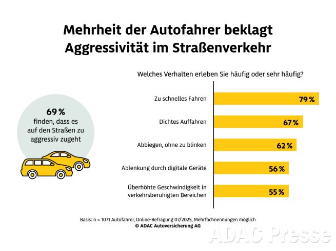 (ADAC Autoversicherung AG) Laut Straßenverkehrsordnung haben sich alle Verkehrsteilnehmer jederzeit vorsichtig und rücksichtsvoll zu verhalten. Tatsächlich beklagen jedoch 69 Prozent der Autofahrer, dass es auf den Straßen zu aggressiv zugeht. Das ist das Ergebnis einer deutschlandweiten Umfrage der ADAC Autoversicherung.
