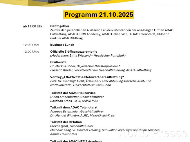 20. Oktober 2025, 12 Uhr unter medien@adac.de mit, ob Sie an dem Medientermin sowie der Führung um 12 Uhr teilnehmen. Bitte beachten Sie: der Zugang zum Sonderflughafen Oberpfaffenhofen ist nur mit einer namentlichen Anmeldung möglich.