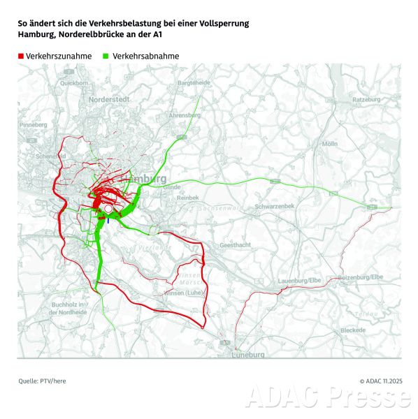 Müsste die mehr als 60 Jahre alte Norderelbbrücke an der A 1 von einem Tag auf den anderen gesperrt werden, würde bundesweit der höchste wirtschaftliche Schaden entstehen. Sie wird täglich von rund 125.000 Fahrzeugen genutzt, bei einer Sperrung würde ein Großteil auf die ohnehin schon belastete A7 ausweichen, aber auch in das Hamburger Stadtgebiet. Pkw-Fahrer müssten pro Jahr rund 150 Millionen Kilometer zusätzlich zurücklegen. Die Zeit, die Betroffene für Umwegfahrten zusätzlich benötigen oder in Staus verbringen, würde rund 14 Millionen Stunden betragen. Alleine der Weg zwischen dem Kreuz HH Südost und dem Dreieck Norderelbe würde sich wegen den Umleitungsstrecken um 58 Minuten erhöhen. Steigen würden dadurch zudem der Spritverbrauch, die CO2-Emissionen sowie Lärm und Staus, insbesondere in den näheren Stadtgebieten. Der volkswirtschaftliche Schaden läge bei 334 Millionen Euro jährlich. Sperrungen dauern meist mehrere Jahre, bis Planung, Genehmigung und Bau einer Ersatzbrücke abgeschlossen sind.
