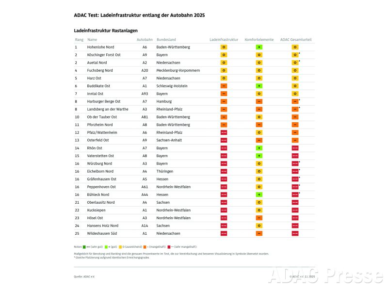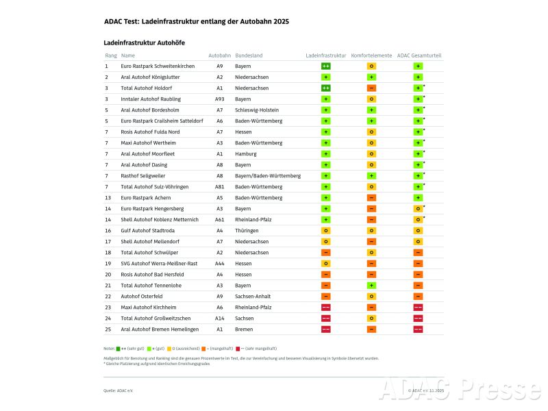 Positiv registrierten die Tester dagegen, dass 31 Anlagen (62 Prozent) bereits über Ultraschnell-Ladesäulen mit 300 kW verfügten, so dass sie auch bei zwei angeschlossenen Fahrzeugen noch jeweils bis zu 150 kW zum Laden bieten. Zwei Anlagen – Rosis Autohof Fulda Nord an der A7 und der Inntaler Autohof Raubling an der A93 – hatten sogar 400-kW-Ladesäulen installiert und schnitten insgesamt mit „gut“ ab. Generell erzielten Autohöfe deutlich bessere Urteile als Rastanlagen: Alle 13 „gut“-Bewertungen gingen an Autohöfe. Spitzenreiter im Test wurde der Euro Rastpark Schweitenkirchen an der A9, gefolgt vom Aral Autohof Königslutter an der A2.