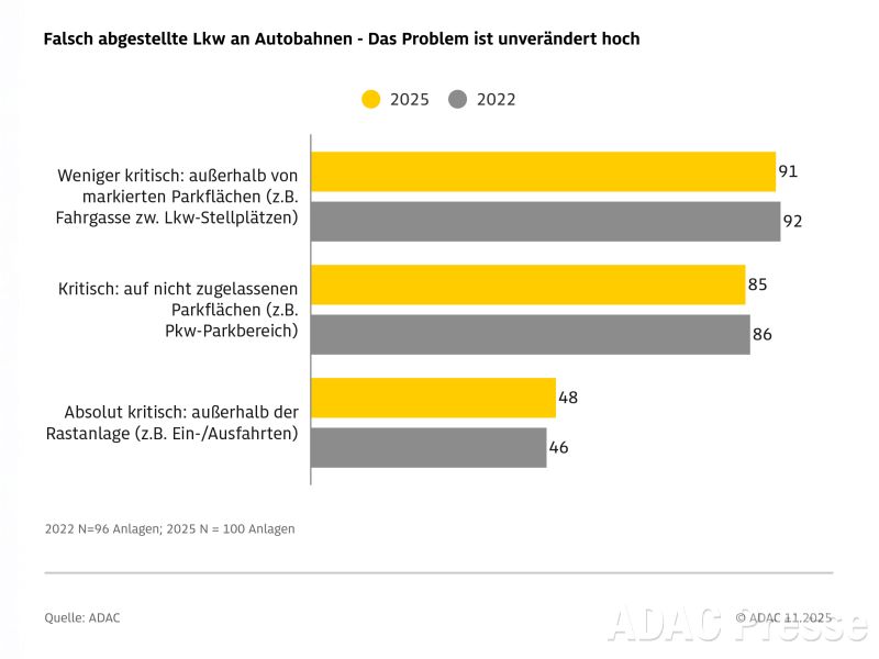 Drei Jahre nach der letzten Untersuchung zur Lkw-Parksituation an deutschen Autobahnen zeigt sich: Das Problem ist weiterhin gravierend und unverändert groß. Laut einer aktuellen ADAC Erhebung an 100 Rastanlagen parkten an fast der Hälfte der Standorte (48 von 100) Lkw in hochriskanten Bereichen wie Ein- und Ausfahrten oder gar auf dem Seitenstreifen – also in der Gefahrenkategorie Rot. Auf 85 der 100 getesteten Anlagen standen Lkw im absoluten Halteverbot oder auf nicht für sie zugelassenen Flächen, beispielsweise auf Pkw-Parkplätzen (Kategorie „Orange“). Das Parken außerhalb markierter Flächen, etwa in den Fahrgassen zwischen den Stellplätzen, war nahezu die Regel (Kategorie „Gelb“).