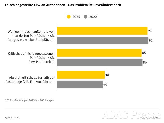 Der ADAC fordert seitens der Politik ein entschlossenes Handeln zur Entschärfung des Lkw-Stellplatzmangels. Der Ausbau und die effizientere Nutzung vorhandener Flächen sollen beschleunigt werden, unterstützt durch intelligente Parksysteme wie das Kolonnenparken sowie durch digitale Informationen zur aktuellen Belegung und mögliche Reservierungslösungen. Illegales Parken in gefährlichen Bereichen muss strikt geahndet werden. Je nach Lage können Unternehmen durch die zeitweise Bereitstellung eigener Parkflächen entlasten. Als wichtigen Schritt für eine bessere Auslastungssteuerung sieht der ADAC die seit Juli 2025 laufende digitale Erfassung von Stellplatzdaten aus rund 1.000 Raststätten, die über die „Mobilithek“ Logistikdienstleistern und Navigationsanbietern zur gezielteren Lkw-Lenkung bereitstehen. Diese soll ab 2026 auf alle etwa 1.900 Bundesrastanlagen ausgeweitet werden. Zudem appelliert der Club an alle Verkehrsteilnehmende, Lkw-Flächen freizuhalten und Rastanlagen besonders vorsichtig zu befahren. Denn klar ist: Alle Verkehrsteilnehmende profitieren davon, wenn Lkw-Fahrende ihre notwendigen Ruhezeiten sicher einhalten können.