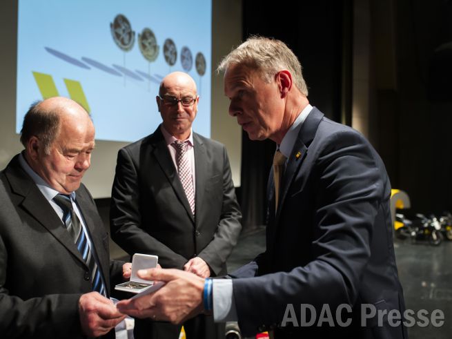 Aber nicht nur die Erfolge auf der Strecke standen bei der Sportfahrerehrung des ADAC Nordbaden im Fokus, sondern auch das für den Motorsport so unentbehrliche Ehrenamt neben der Strecke und in der Organisation von Motorsportveranstaltungen. Dr. Heino Albering, Vorsitzender des ADAC Nordbaden, verlieh am Samstagabend gleich zwei Mal die höchste Auszeichnung für ehrenamtliches Engagement. Vor den über 300 geladenen Gästen überreichte er Edgar Kindsvogel vom MSC Kraichtal e.V. und Steffen Huxel vom MSC Odenheim e.V. die Ewald-Kroth-Medaille in Gold mit Brillant für ihren jahrzehntelangen Einsatz für den Motorsport. Die Ewald-Kroth-Medaille in Gold mit Kranz überreichte Albering an Bernhard Weber vom MSC Ziegelhausen e.V.. Mit den Worten „es sind Menschen wie ihr, die für den Motorsport unverzichtbar sind und die diesen überhaupt erst möglich machen“ ehrte Albering die Ehrenamtlichen unter großem Applaus auf der Bühne der Hockenheimer Stadthalle.
