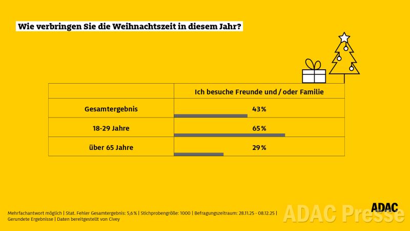 Für die Liebsten machen viele Menschen aber eine Ausnahme: 43 Prozent der Befragten gaben an, in der Weihnachtszeit Freunde und/oder die Familie zu besuchen. Dabei zeigen sich deutliche Altersunterschiede: Während 65 Prozent der 18- bis 29-Jährigen entsprechende Besuche planen, sind es in der Altersgruppe ab 65 Jahren lediglich 29 Prozent.