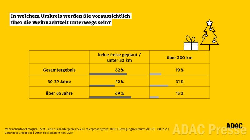 Die Bayern lassen das Jahr eher ruhig ausklingen. Das hat eine repräsentative Umfrage des ADAC Südbayern zum Mobilitätsverhalten in der Weihnachtszeit ergeben. Hauptgrund, um längere Strecken anzutreten: Der Besuch von Familie und Freunden. Das Auto ist dafür Verkehrsmittel Nummer eins.